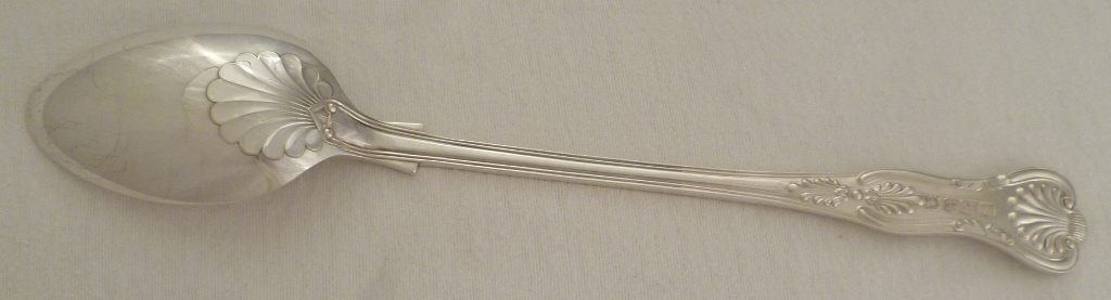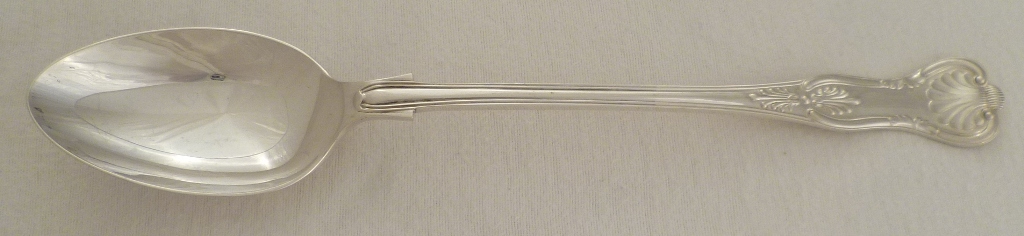 DESCRIPTION | Good silver double struck King's pattern basting spoon with a diamond shell heel, upturned terminal and no engraving or erasure. |