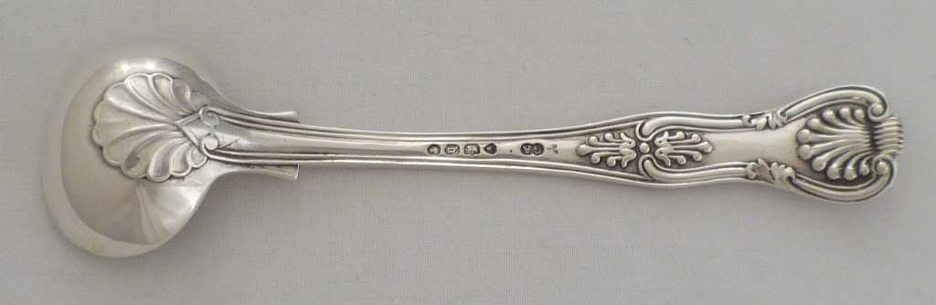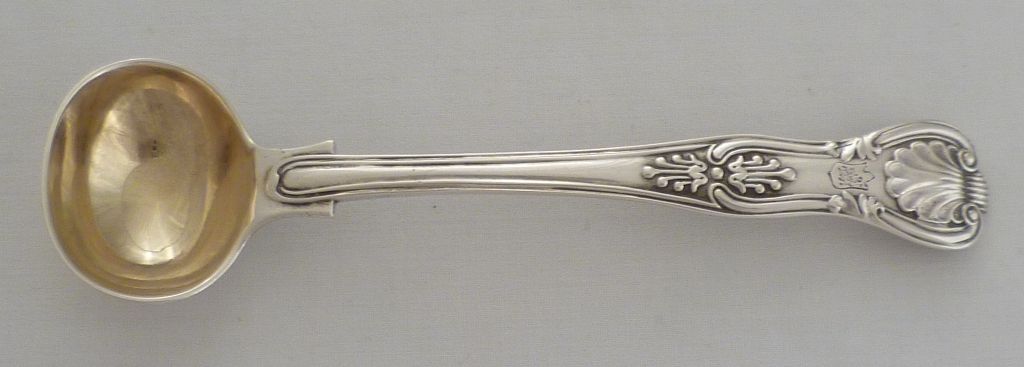 DESCRIPTION | Superb Victorian silver gilt double struck King's pattern with diamond shell heel salt spoon, crested. |