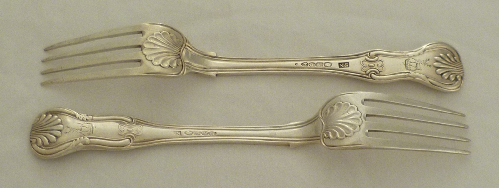 DESCRIPTION | Pair of Irish Georgian silver double struck King's HourGlass pattern with union shell heel dessert forks, crest engraved verso. |