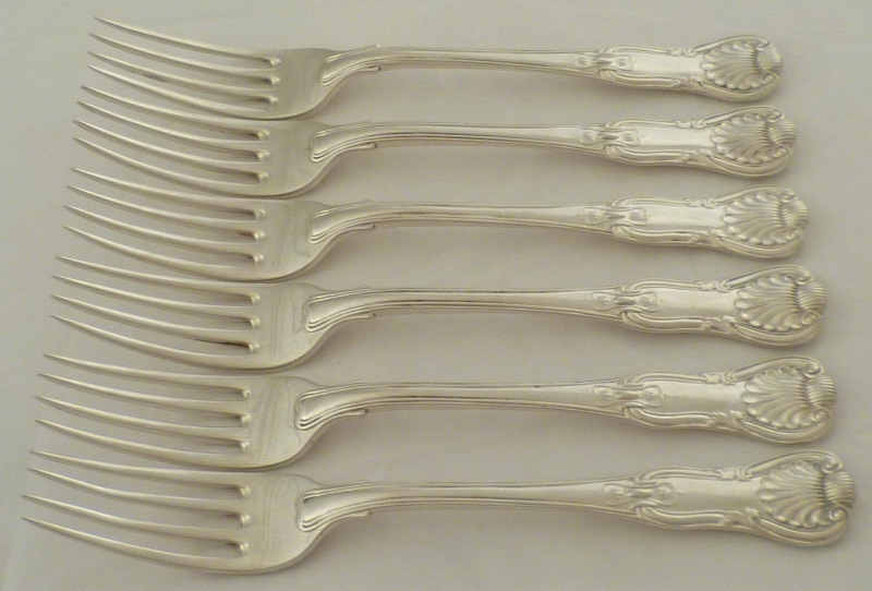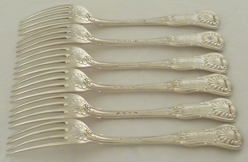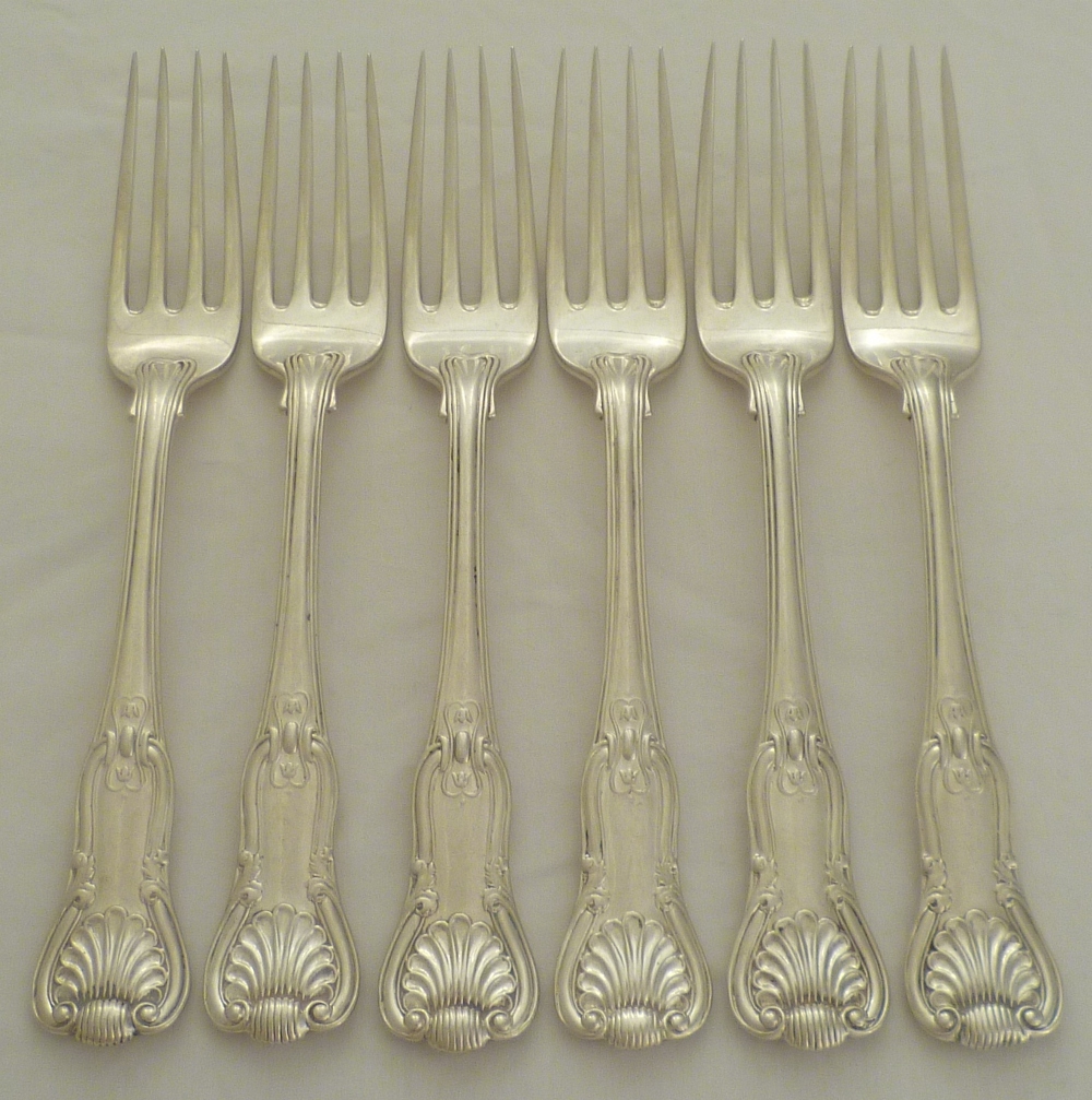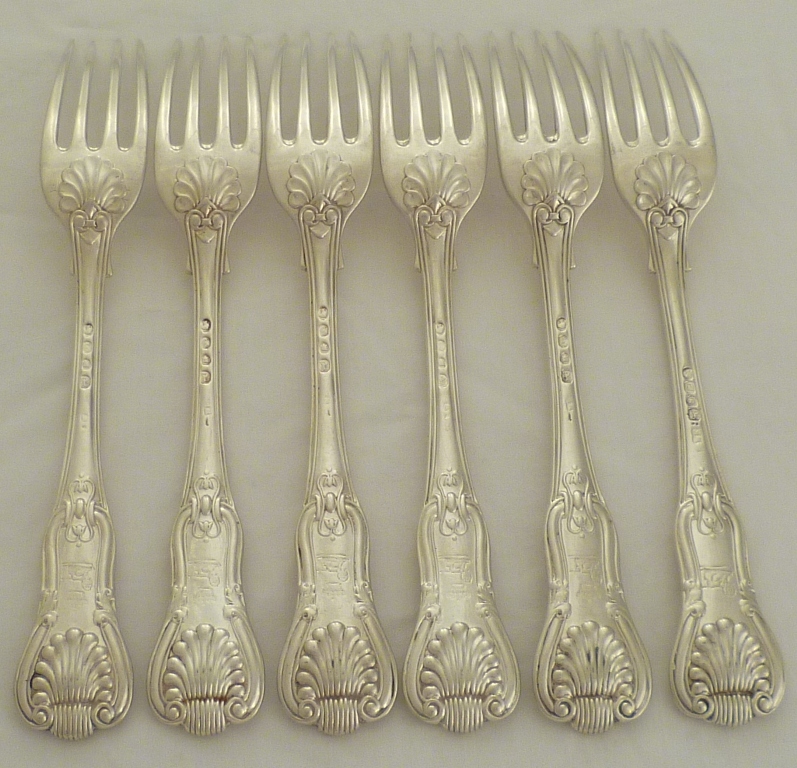 Hefty set of six Victorian silver double struck King's HourGlass pattern table forks with diamond shell heels and level tines. All engraved verso with a crest below an earl's coronet apart from the 1839 example which has only the