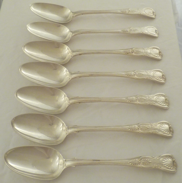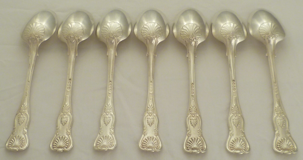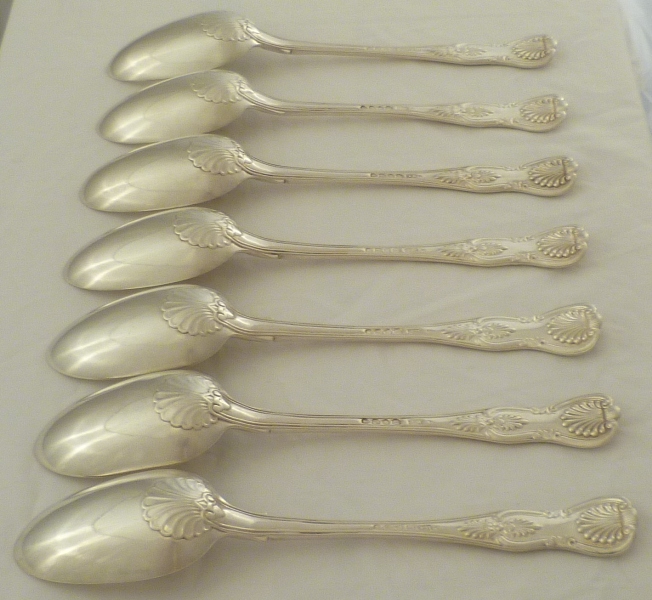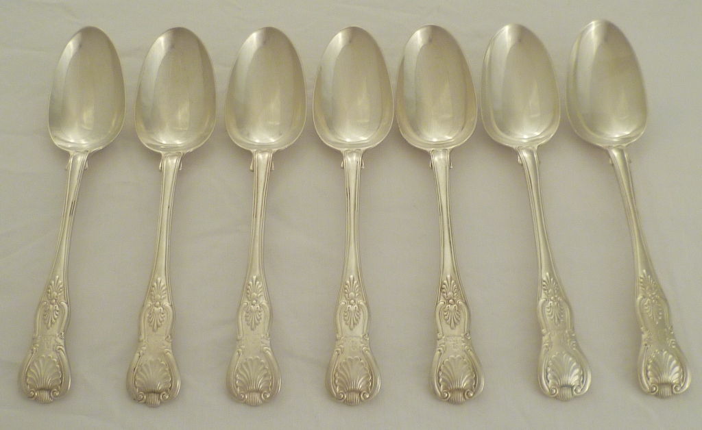 DESCRIPTION | Seven hefty William IV silver double struck King's pattern table spoons with diamond shell heels and crest engraving. I have matching pieces available. |