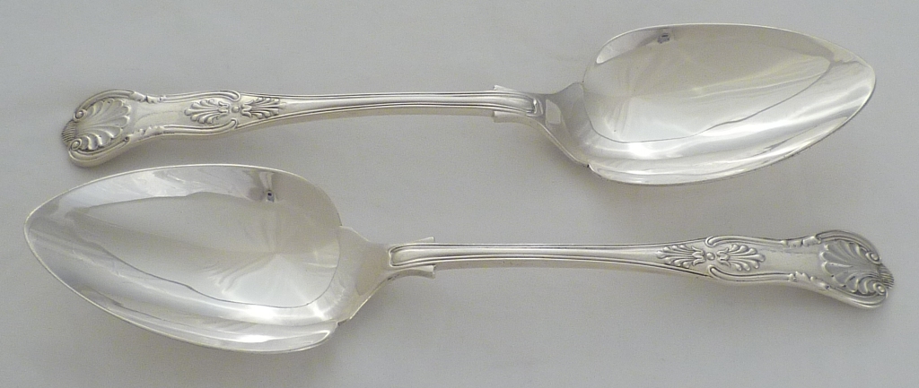DESCRIPTION | Pair of Edwardian silver double struck King's pattern ice cream serving spoons with diamond shell heels to the heart shaped bowls. Sturdy construction and no engraving or erasure. |