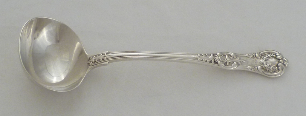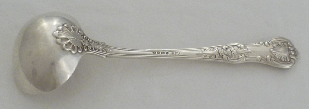 DESCRIPTION | Magnificent Victorian silver double struck Queen's pattern sauce ladle with a good frontal crest engraving. Matching pieces are available. |