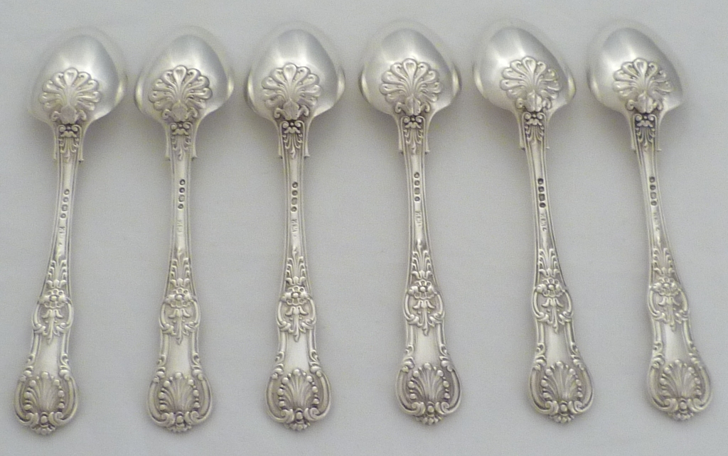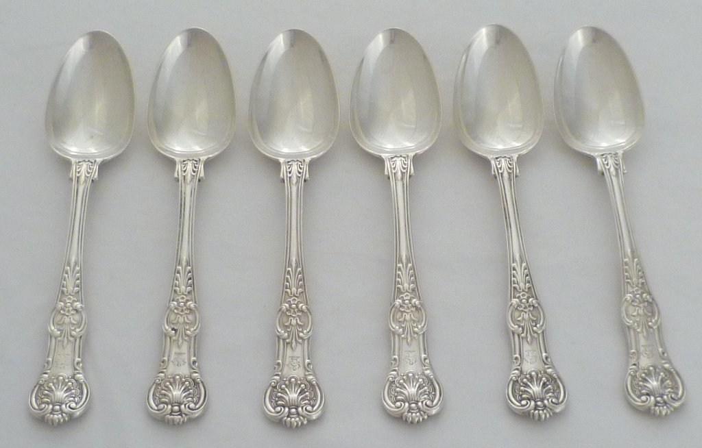 DESCRIPTION | Set of six magnificent Victorian silver double struck Queen's pattern teaspoons with a good frontal crest engraving. Matching pieces are available. |