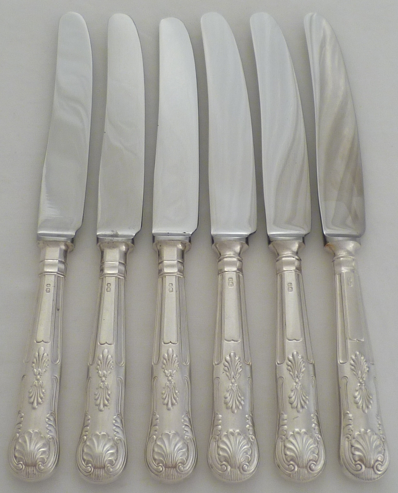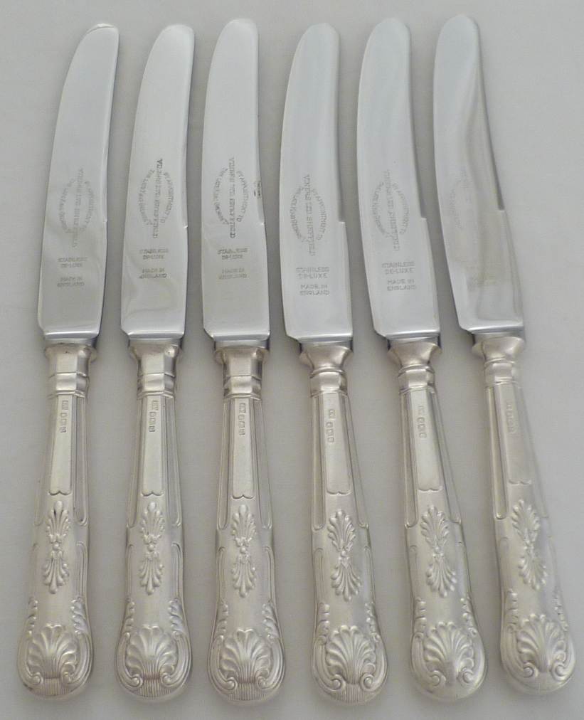 DESCRIPTION | Good and useful set of six King's pattern dessert knives with loaded silver handles and mirror polished stainless steel blades that are also used for salads and starters. The joint between the handle and blade is soldered so these knives can be safely washed in a modern dishwasher and/or hot water. |