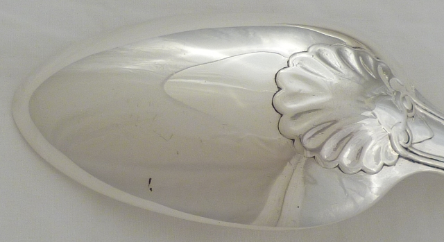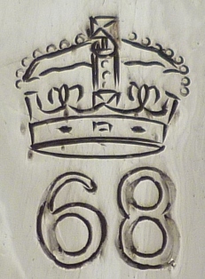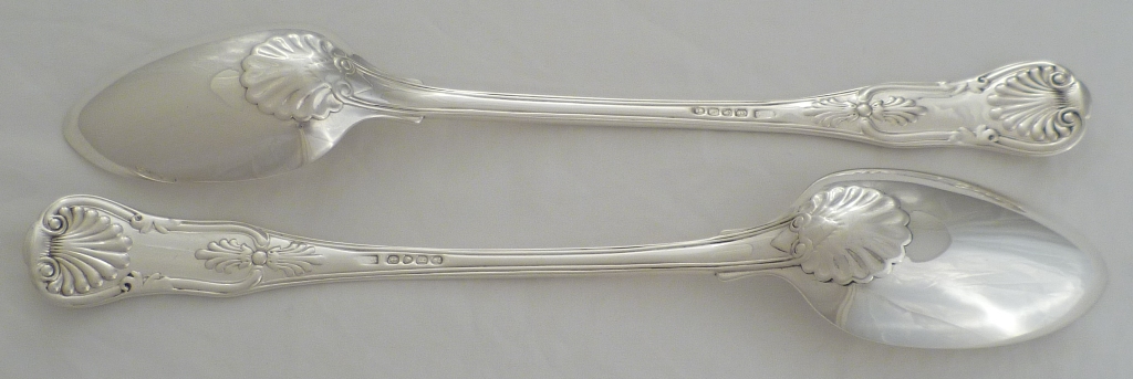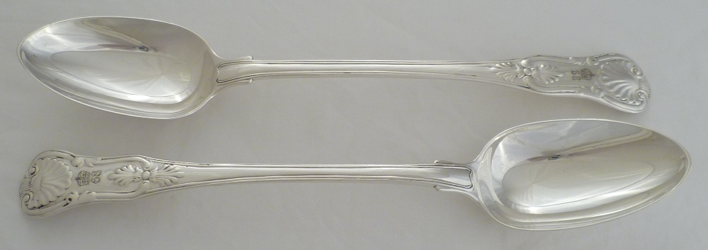 DESCRIPTION | Pair of Georgian silver double struck King's pattern with diamond shell heel basting or gravy spoons with a frontal engraving of a crown above '68'. I have a similar soup ladle and two pairs of sauce ladles m6156 available here. |