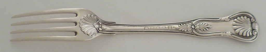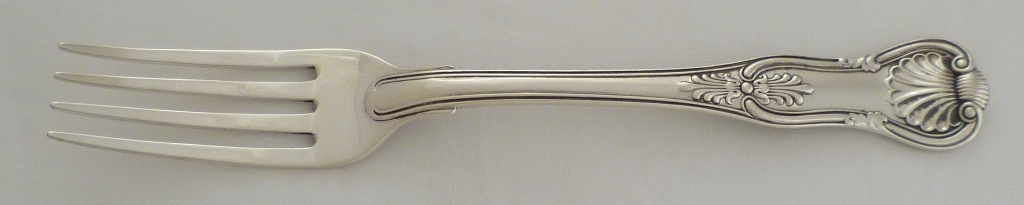 DESCRIPTION | One Georgian silver double struck King's pattern with diamond shell heel dessert fork. |