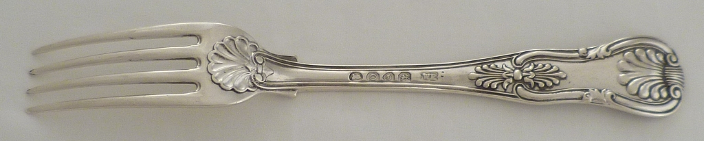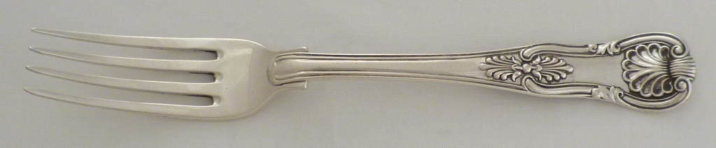 DESCRIPTION | One Georgian silver double struck King's pattern with diamond shell heel dessert fork. |