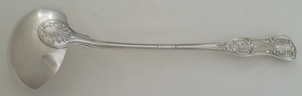 DESCRIPTION | Hefty Victorian silver double struck Queen's pattern soup ladle with a very special drop to the bowl back. Nice crest engraving to the front of the terminal, monogram to the rear. |