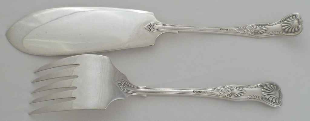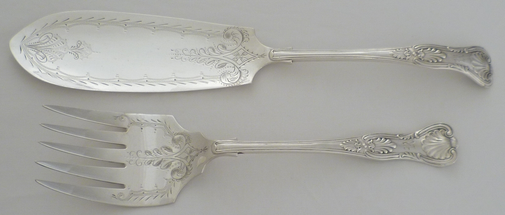 DESCRIPTION | Good pair of silver double struck King's pattern with diamond heels fish servers with engraved decoration and frontally engraved 'R'. |