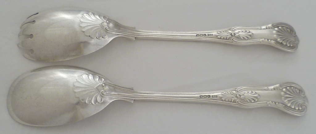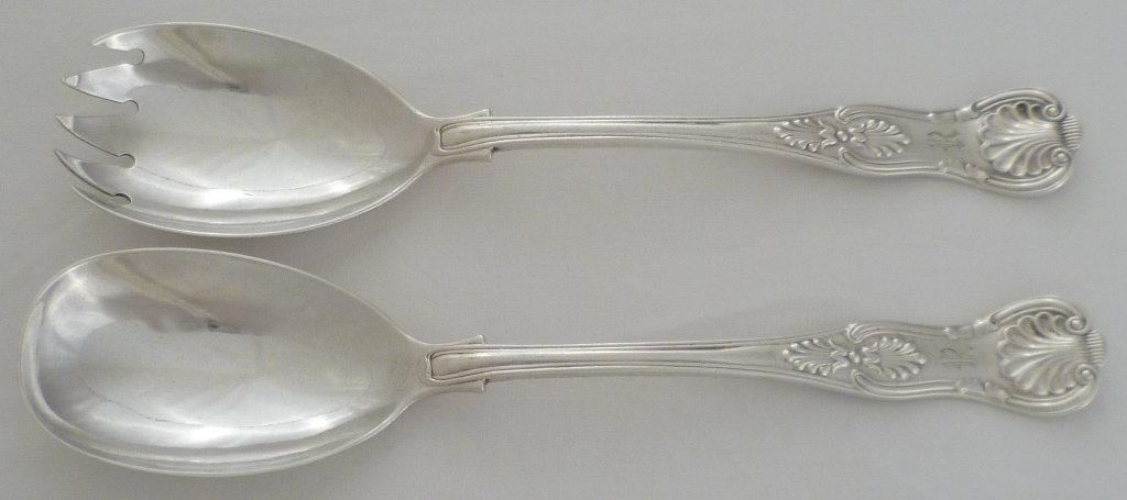 DESCRIPTION | Good pair of silver double struck King's pattern with diamond shell heels salad servers with frontally engraved 'R'. |