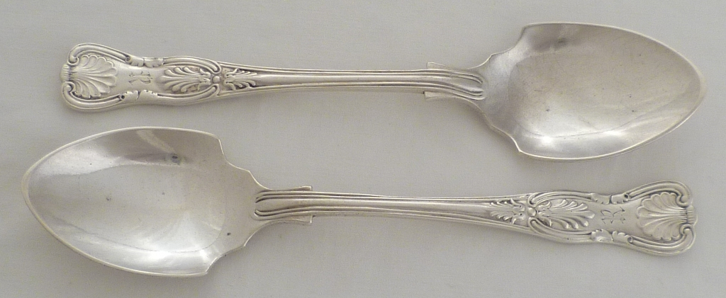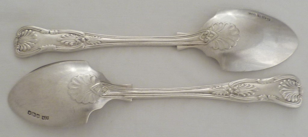 DESCRIPTION | Good pair of silver double struck King's pattern with diamond shell heels preserve spoons with frontally engraved 'R'. |