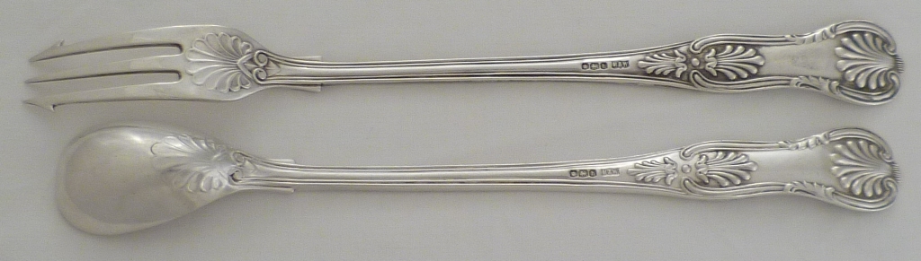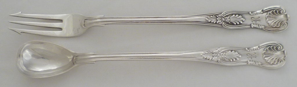 DESCRIPTION | Good silver double struck King's pattern with diamond shell heels long pickle fork and spoon with frontally engraved 'R'. |