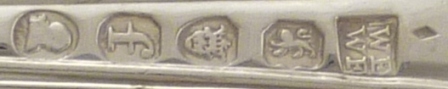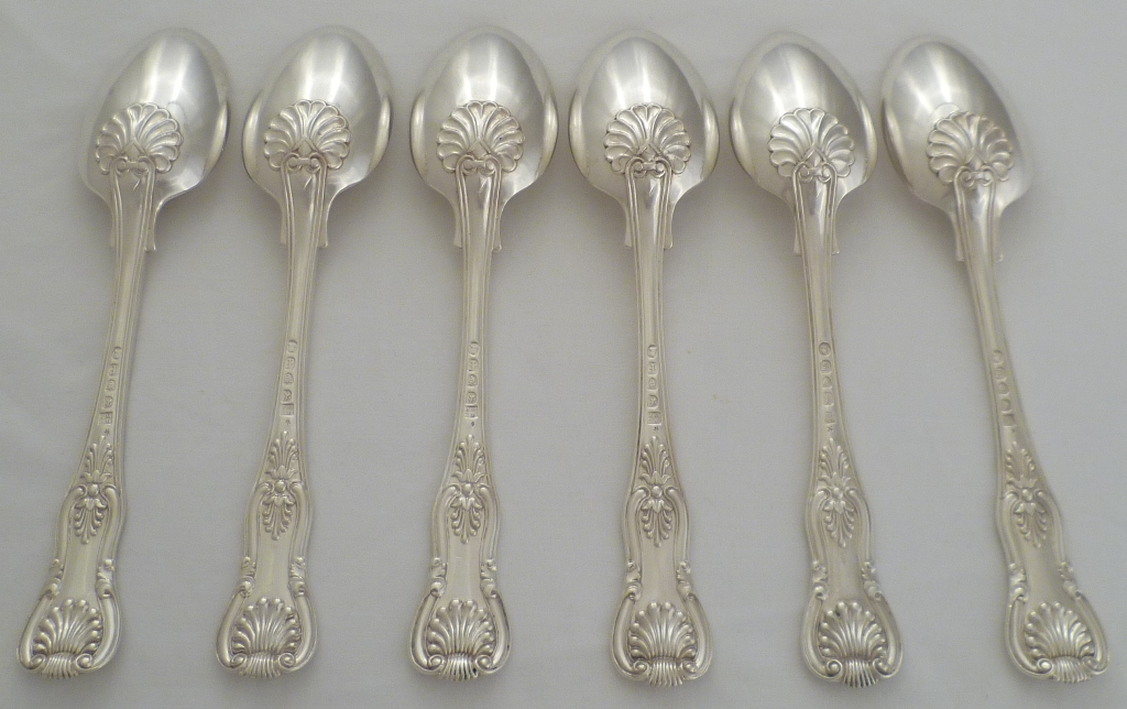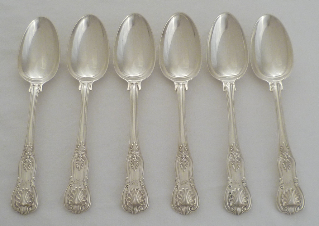 DESCRIPTION | Set of six Georgian silver double struck King's pattern with diamond shell heel dessert spoons with frontal monogram engraving. Dessert spoons are also used for starters, salads and soup. |