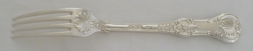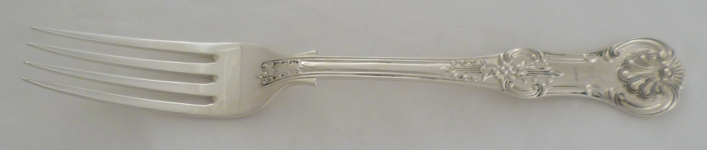 DESCRIPTION | ONE Victorian silver double struck Queen's pattern table fork with a frontal crest engraving. |