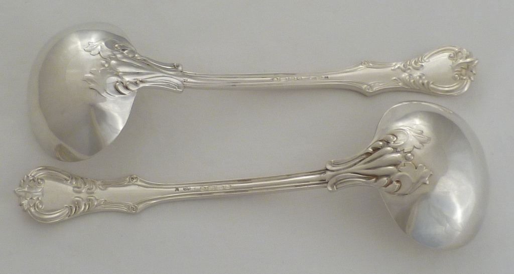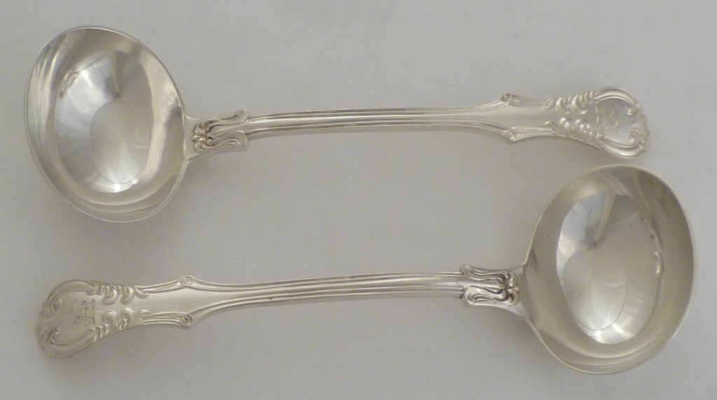 DESCRIPTION | Good pair of Victorian silver Victoria pattern sauce ladles with frontal crest engraving. |
