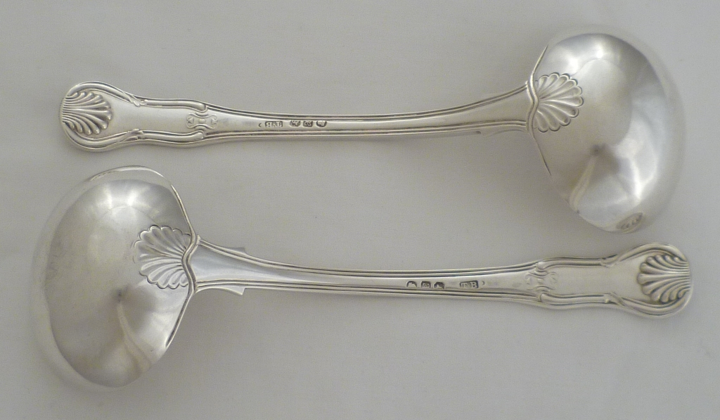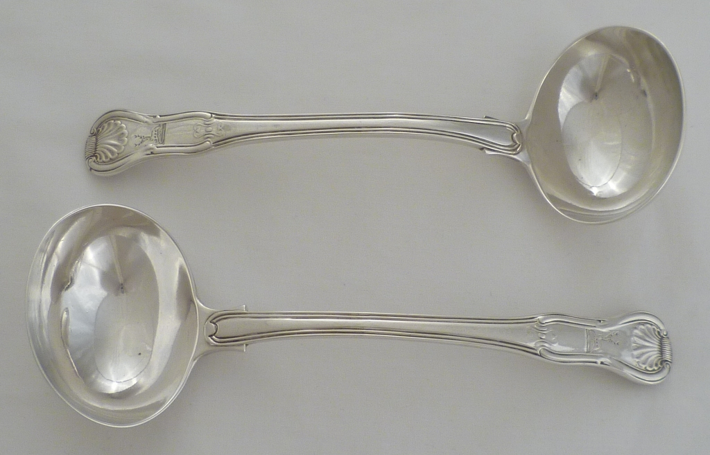 DESCRIPTION | Pair of Georgian silver double struck King's HourGlass pattern sauce ladles with good frontal crest engraving. |