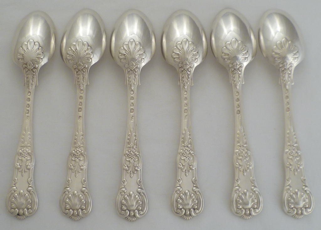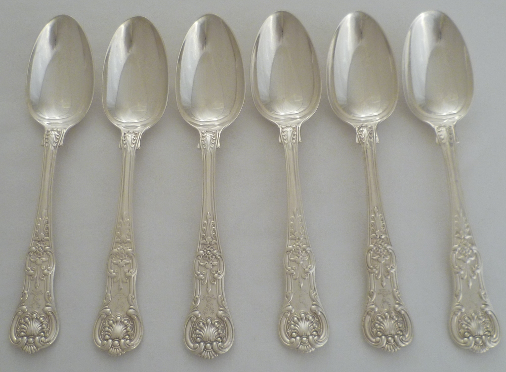 DESCRIPTION | Set of six Victorian silver double struck Queen's pattern dessert spoons with a nice frontal crest engraving. |