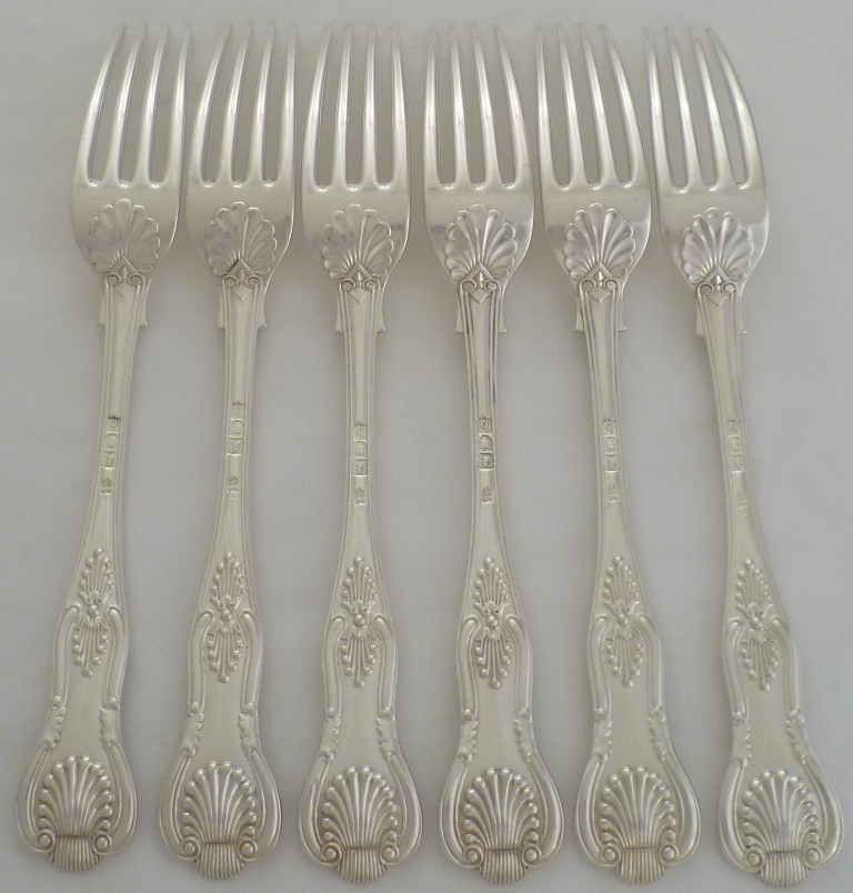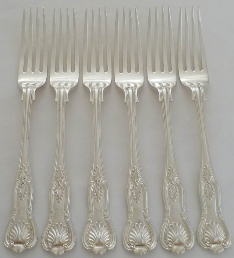 DESCRIPTION | Superb set of six Victorian silver double struck King's pattern with diamond shell heel table forks with nice frontal crest engraving. |