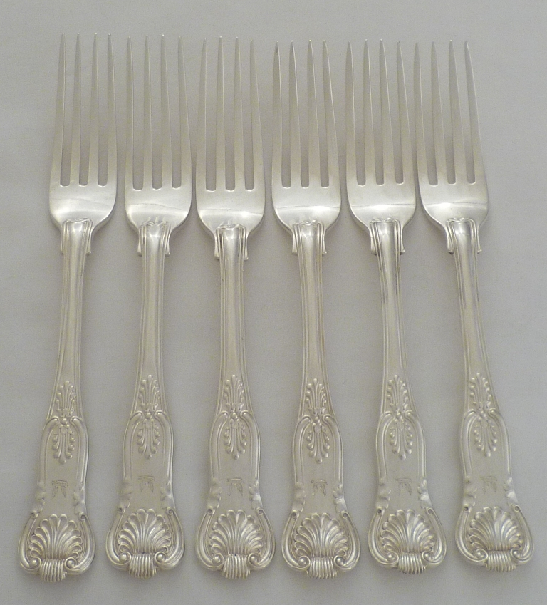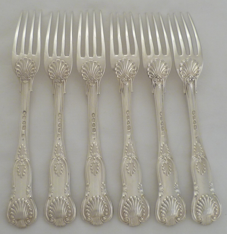 DESCRIPTION | Six William IV silver double struck King's pattern with diamond shell heel dessert forks with nice frontal crest engraving. |