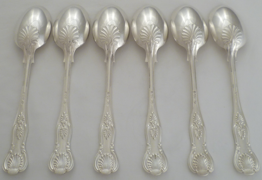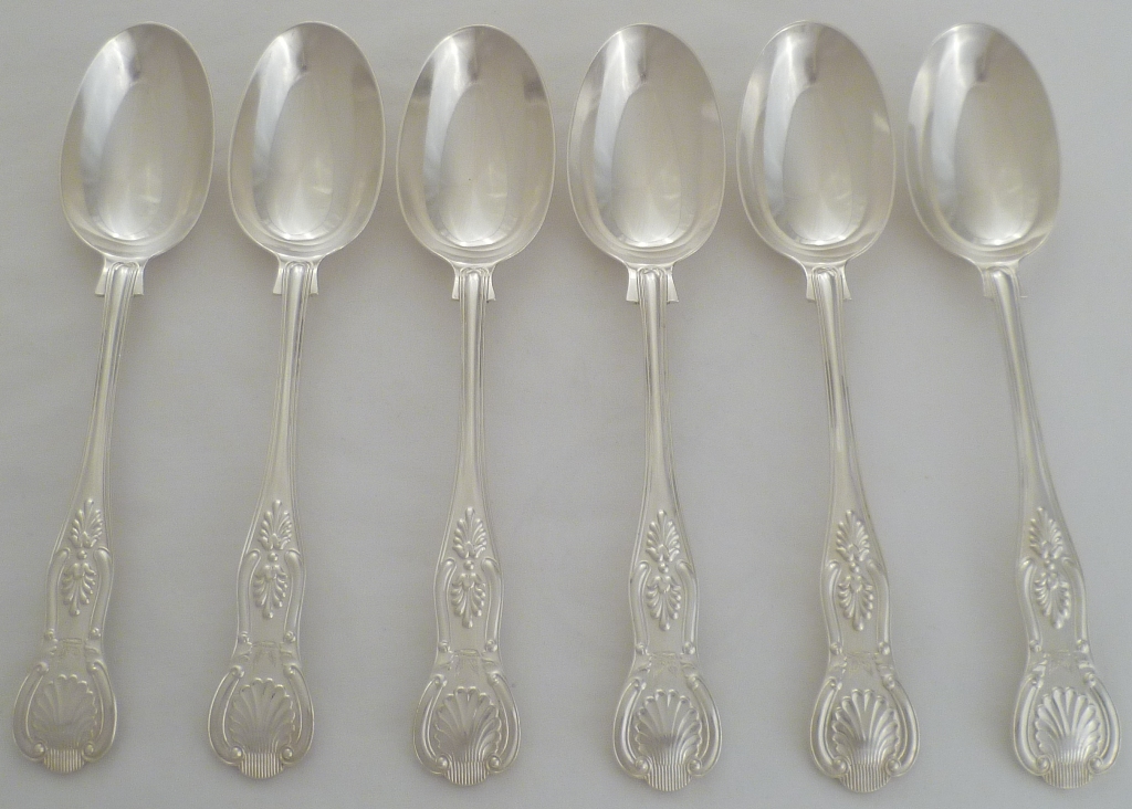 DESCRIPTION | Good set of six Edwardian silver double struck King's pattern with diamond shell heel table spoons with nice frontal crest engraving. |