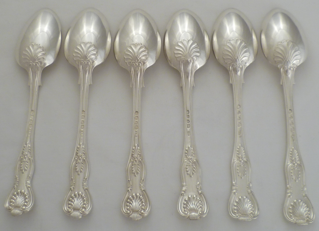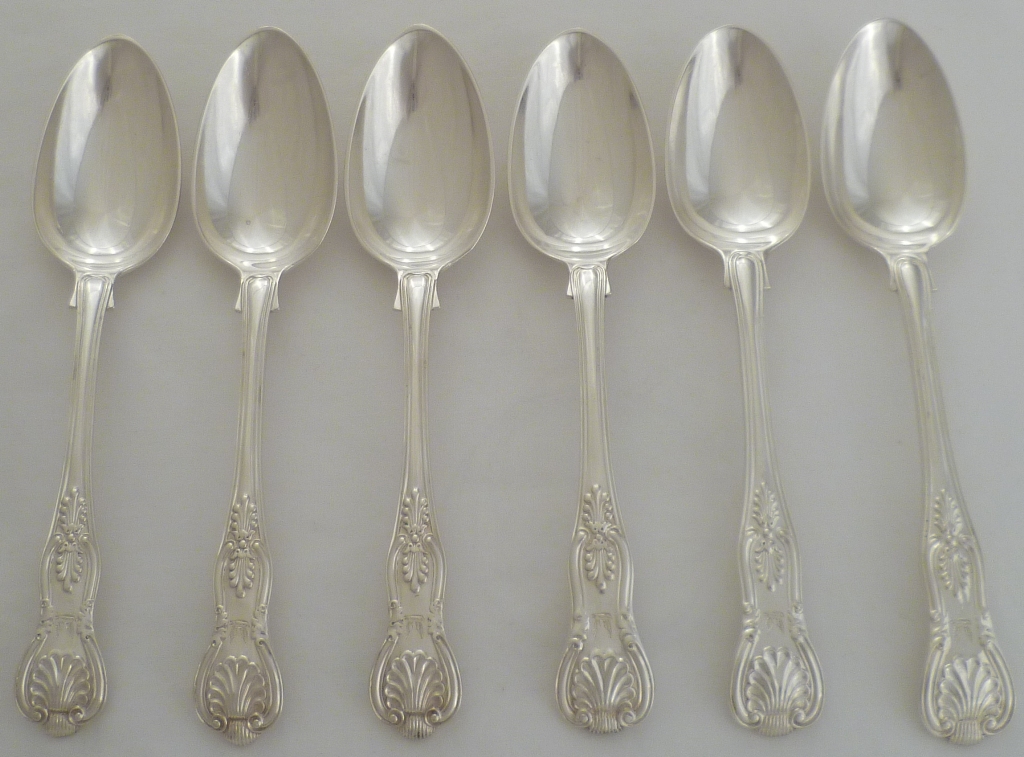 DESCRIPTION | Six silver double struck King's pattern with diamond shell heel dessert spoons with a nice frontal crest engraving over an erasure. |