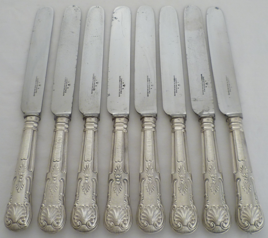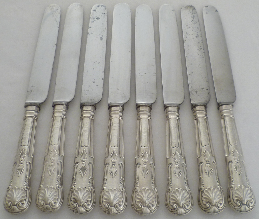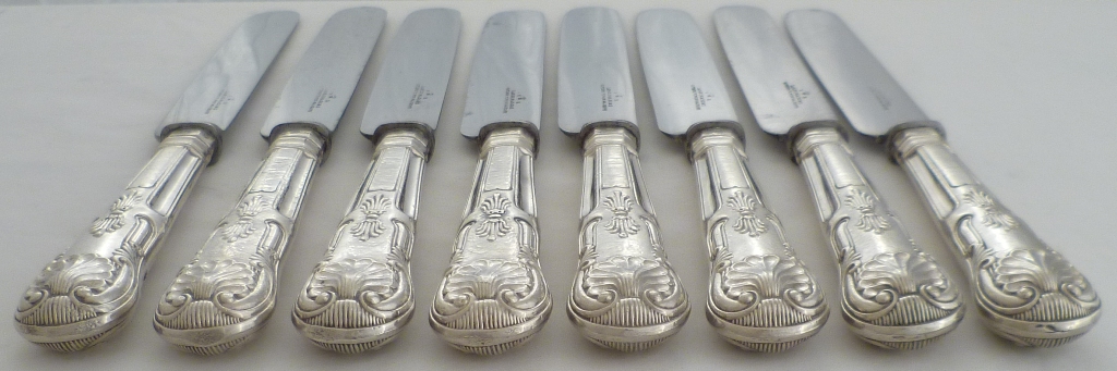 Set of eight large Victorian silver King's pattern table knives with pitch loaded silver handles, original old steel blades and no engraving or erasure. Please