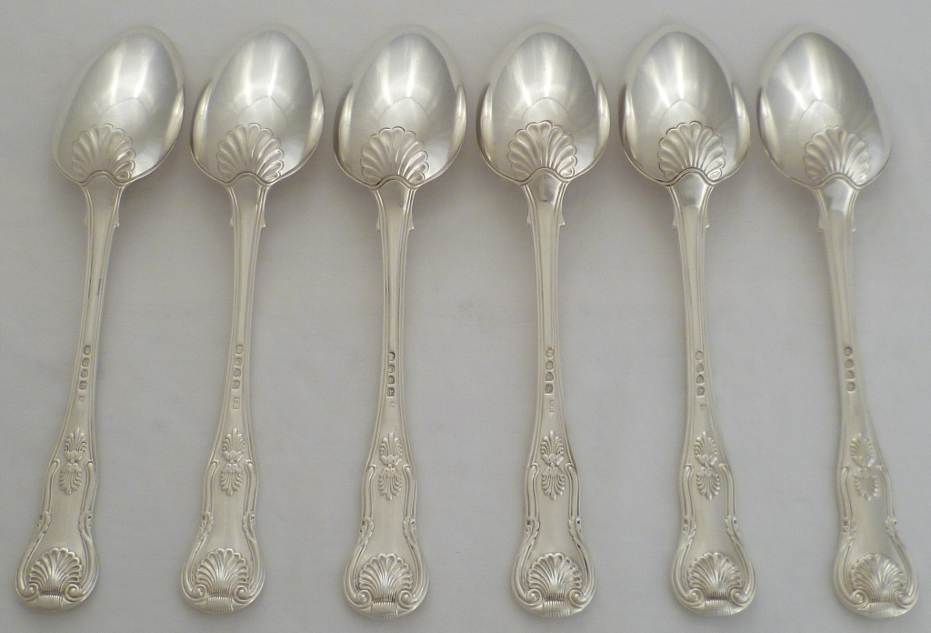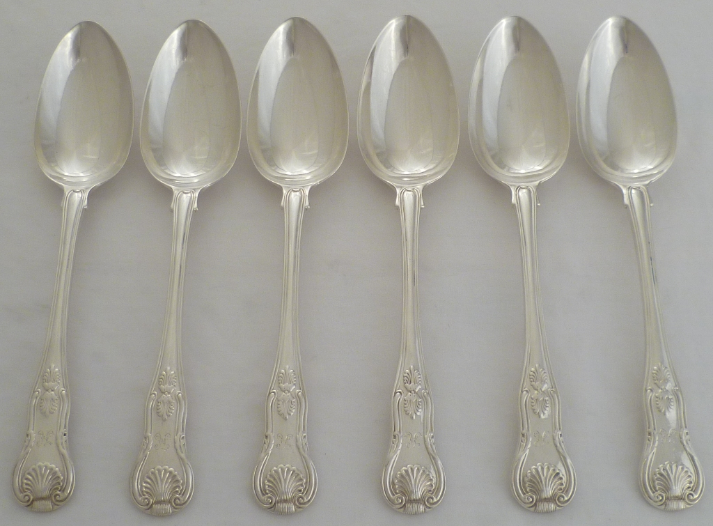DESCRIPTION | Set of six Georgian silver double struck King's pattern with union shell heels table spoons with frontal monogram engravings. |