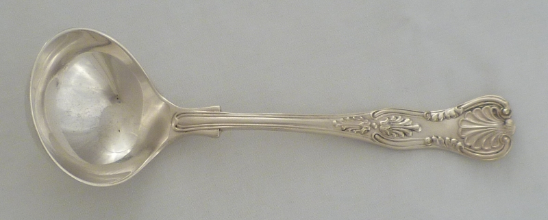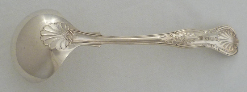 DESCRIPTION | Silver double struck King's pattern with diamond shell heel cream ladle. |