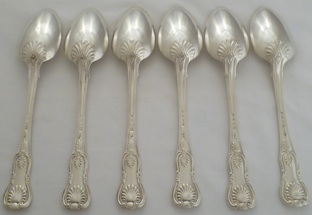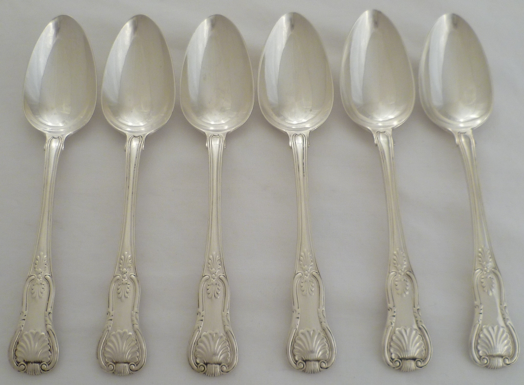DESCRIPTION | Six Georgian silver double struck King's pattern with diamond shell heel table spoons with no engraving. |