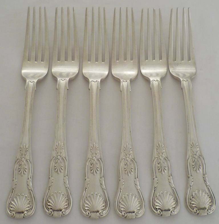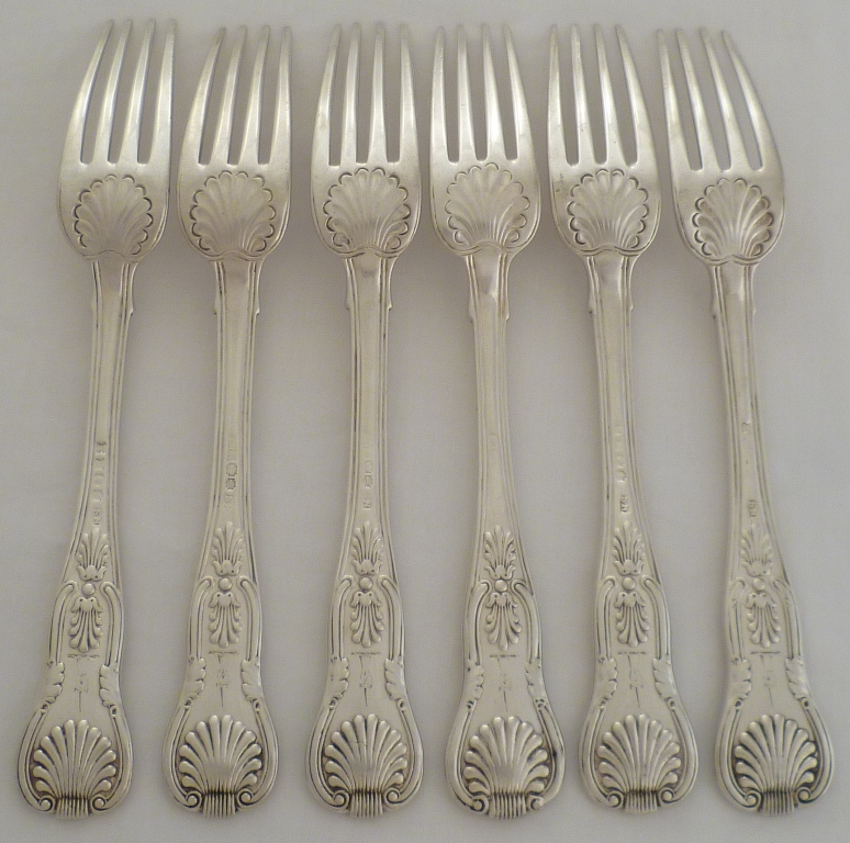 DESCRIPTION | Set of six heavy Irish Georgian silver double struck King's pattern with union shell heel table forks with a crest engraving verso. |