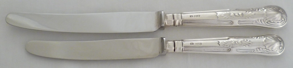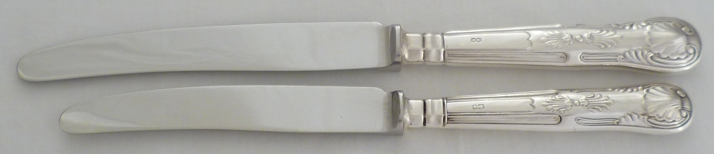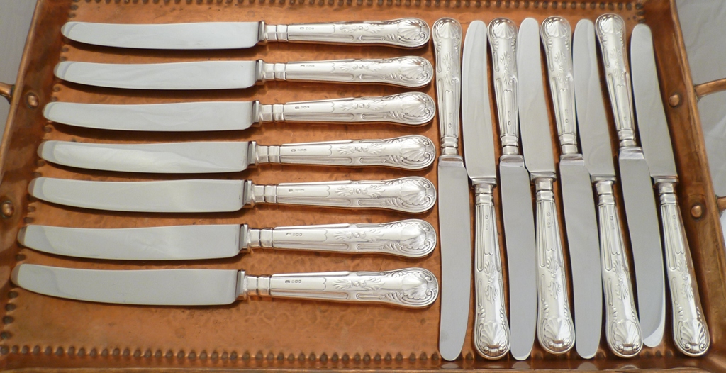 DESCRIPTION | Seven silver handled King's pattern table knives and eight matching dessert knives, all with finger point mirror finish stainless steel blades and no engraving or erasure. These knives have soldered joints with the blades so can be cleaned in a dishwasher. |