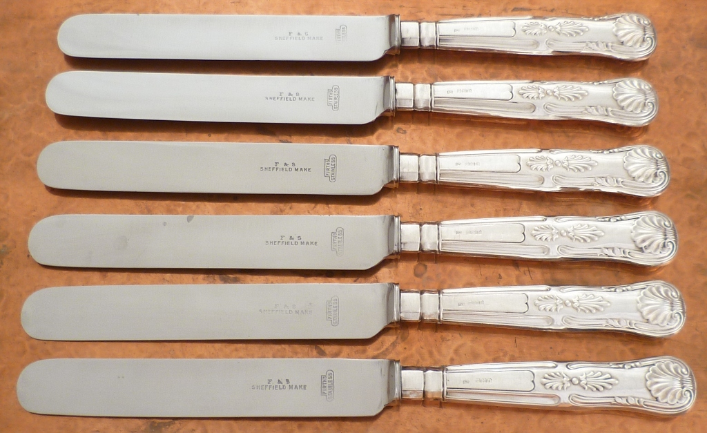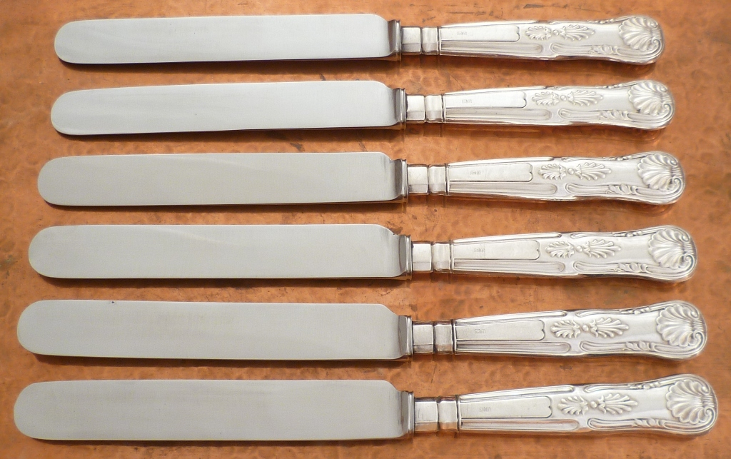 DESCRIPTION | Six silver handled King's pattern table knives with parallel satin finish stainless steel blades and no engraving or erasure. These knives do not have soldered joints with the blades so should not be cleaned in a dishwasher. |
