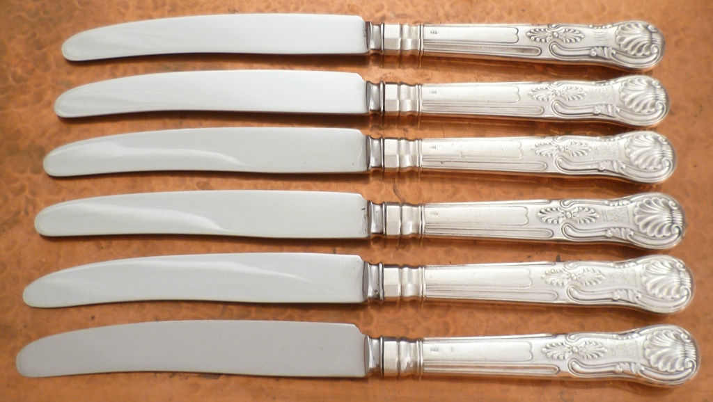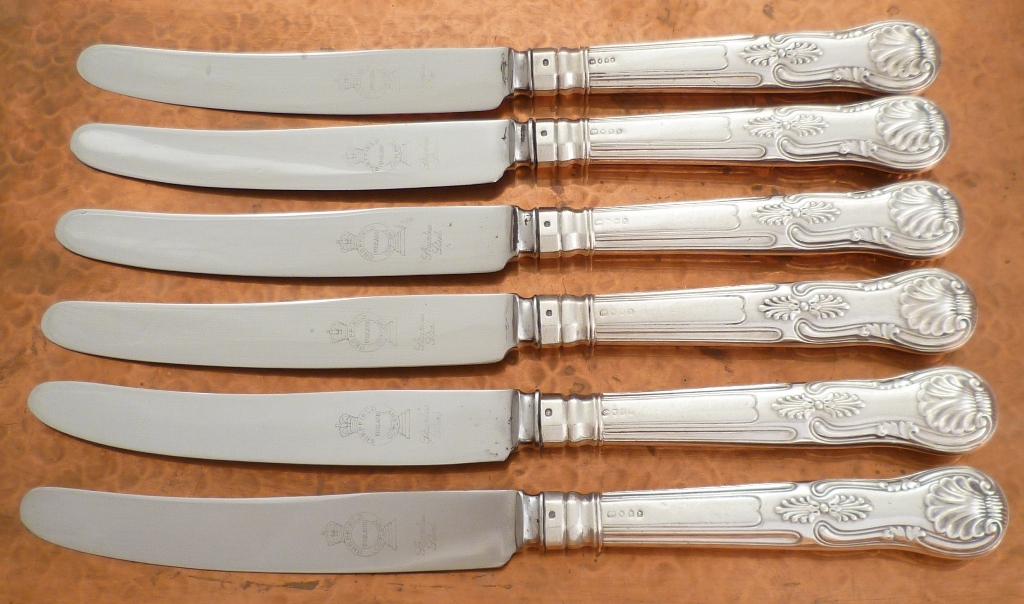 DESCRIPTION | Six Victorian silver handled King's pattern table knives with finger point mirror finish stainless steel blades. Five are crested verso and one has monogram. These knives do not have soldered joints with the blades so should not be cleaned in a dishwasher. |