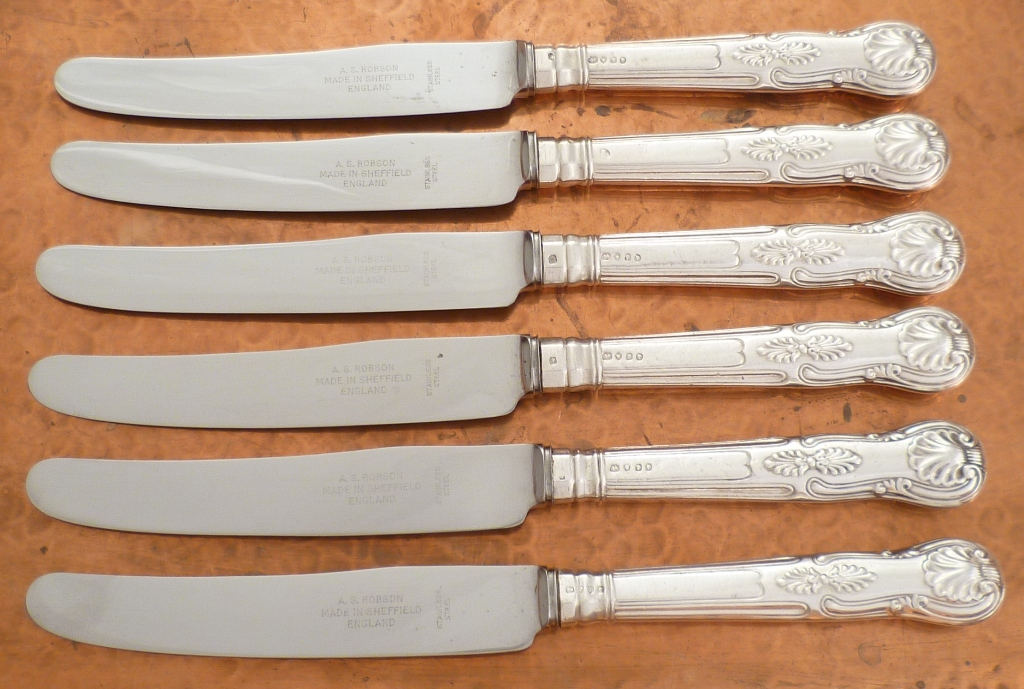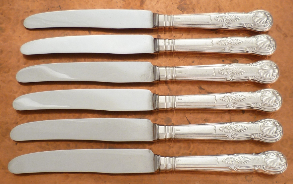 DESCRIPTION | Six Victorian silver handled King's pattern dessert knives with finger point mirror finish stainless steel blades. All are crested verso. These knives do not have soldered joints with the blades so should not be cleaned in a dishwasher. |