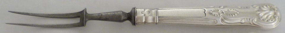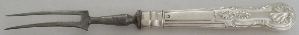 DESCRIPTION | Victorian silver double struck King's pattern meat serving fork with steel tines and no engraving or erasure. Could also be used as a carving fork although there is no safety guard. The pitch loaded silver handle should not be cleaned in a dishwasher. |