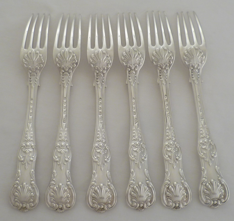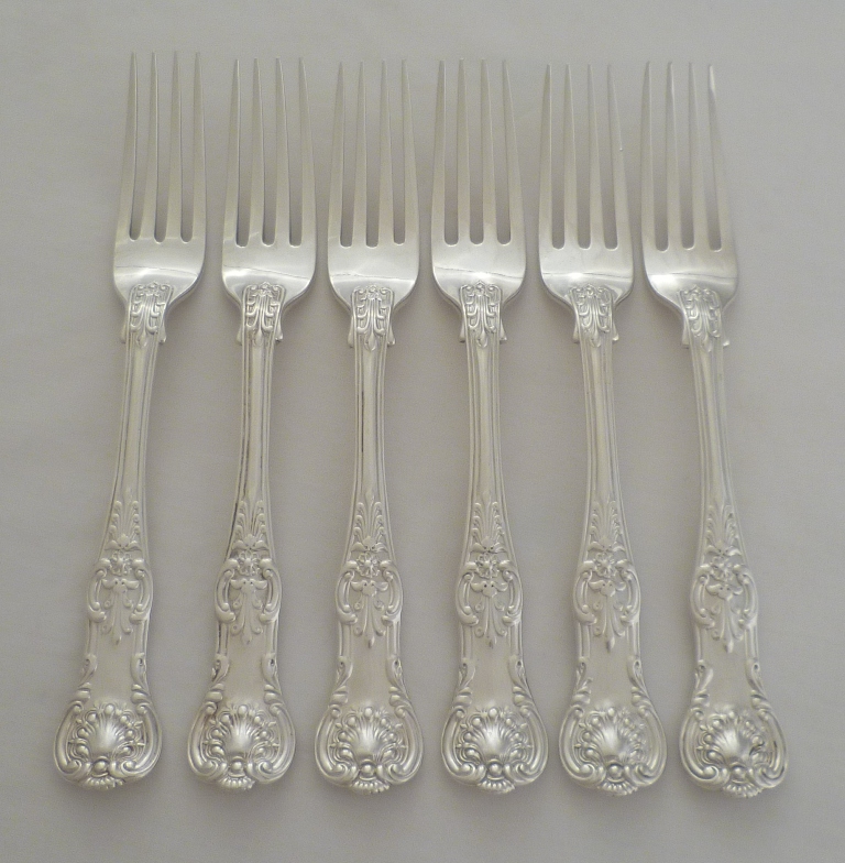 DESCRIPTION | Six Victorian silver double struck Queen's pattern dessert or salad forks with no engraving. |