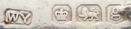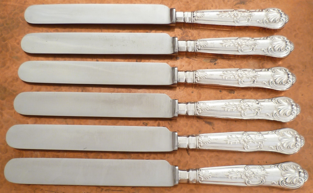 DESCRIPTION | Six silver handled Queen's pattern table knives with no engraving and satin finished stainless steel parallel blades. These pitch loaded handles should not be cleaned in dishwasher. |