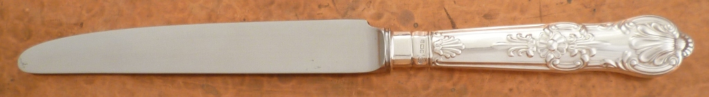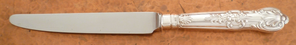 DESCRIPTION | One silver handled Queen's pattern table knife with no engraving and a satin finish finger point stainless steel blade. This knife has a soldered joint so can be safely cleaned in a dishwasher. |
