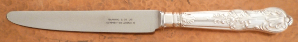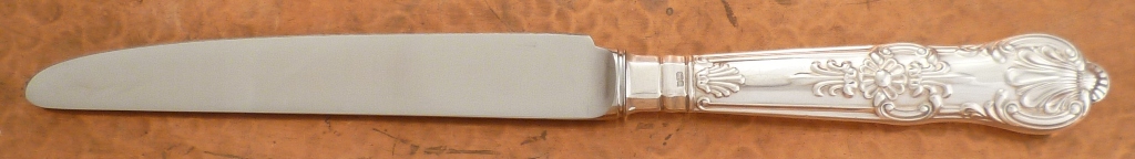 DESCRIPTION | One highest quality silver handled Queen's pattern table knife with no engraving and a satin finish tapered stainless steel blade. This knife has a soldered joint so can be safely cleaned in a dishwasher. |