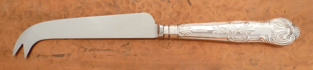 DESCRIPTION | Silver handled Queen's pattern cheese knife with no engraving and a mirror finish stainless steel blade. |