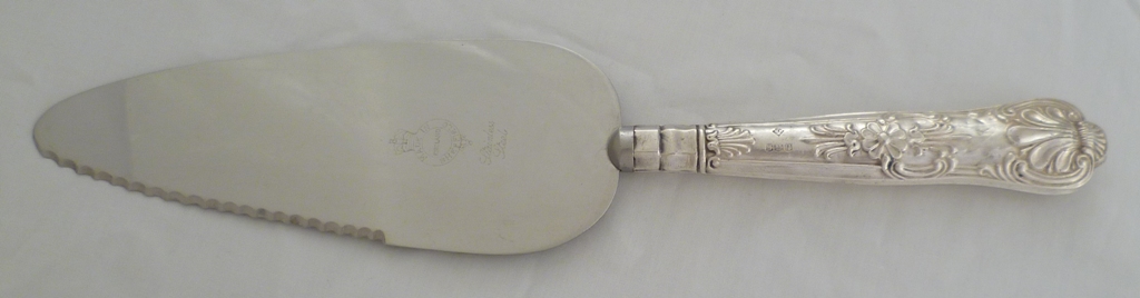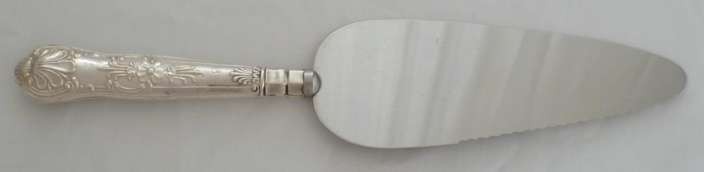 DESCRIPTION | Silver handled Queen's pattern pie or cake server with no engraving and a mirror finish stainless steel blade. |