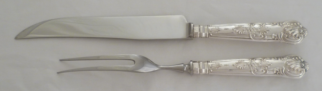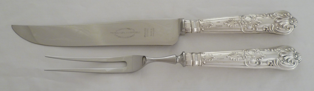 DESCRIPTION | Silver handled Queen's pattern carving knife and fork with no engraving and a mirror finish stainless steel blade and tines. |