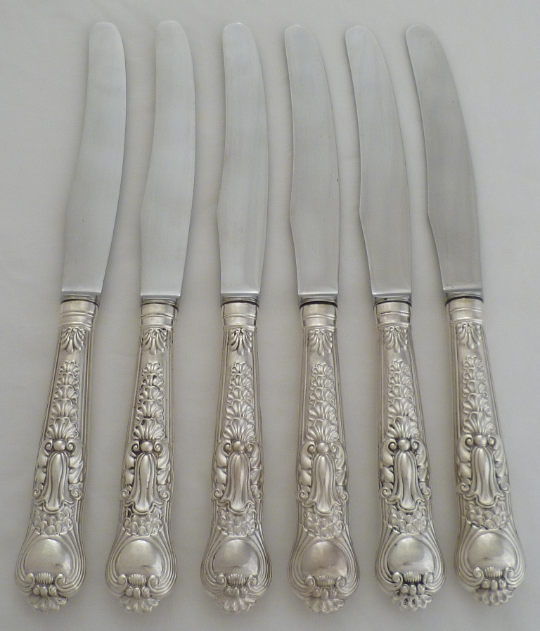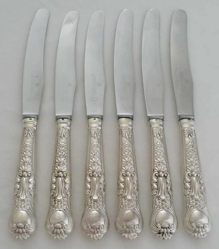 DESCRIPTION | Set of six beautiful Victorian silver Coburg pattern table knives with no engraving or erasure. The blades are Alpha Rustless replacements by Harrods, Knightsbridge and are probably early 20th century. |