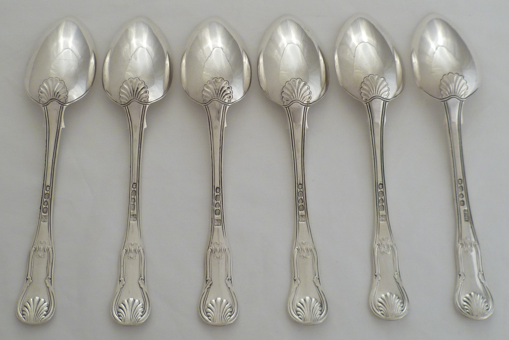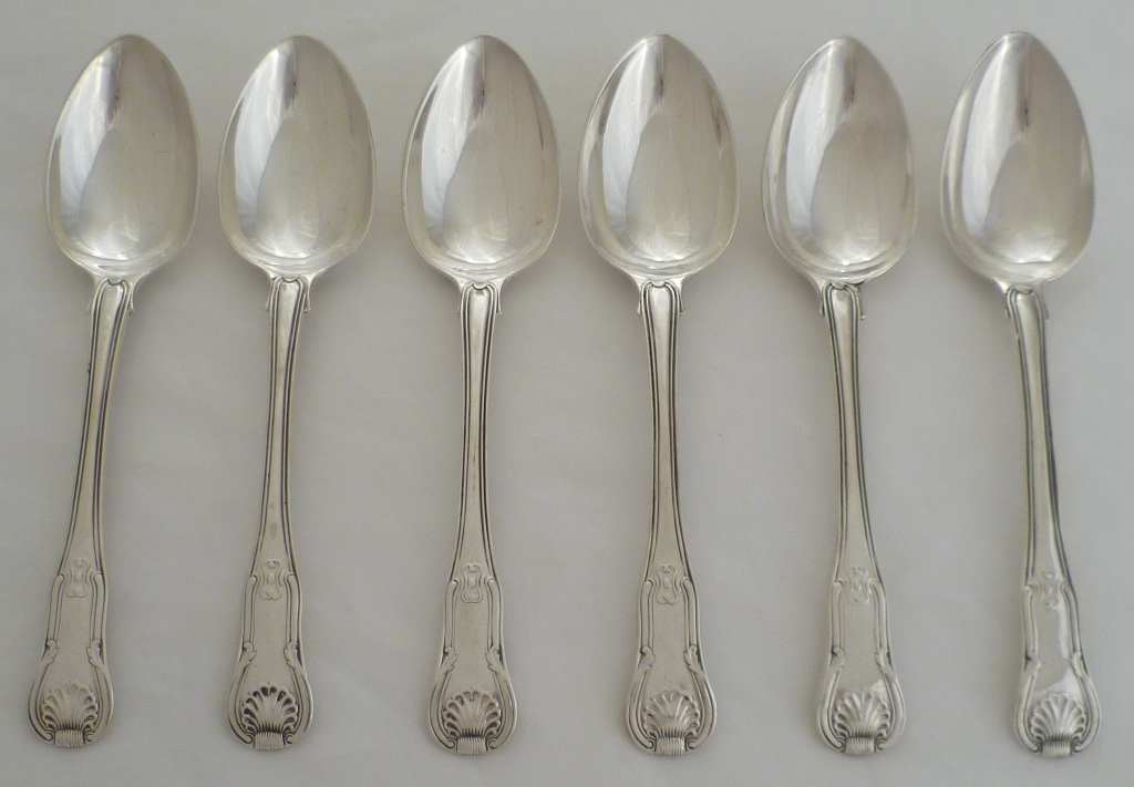 DESCRIPTION | Six Georgian silver double struck King's HourGlass pattern with union shell heel dessert spoons with no engraving or erasure. |