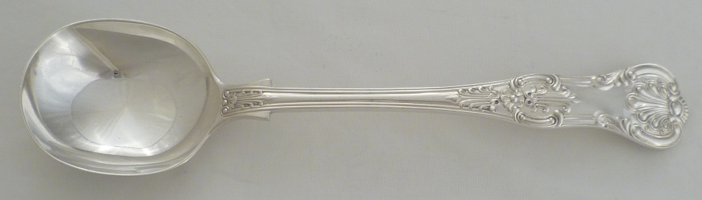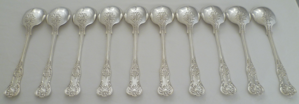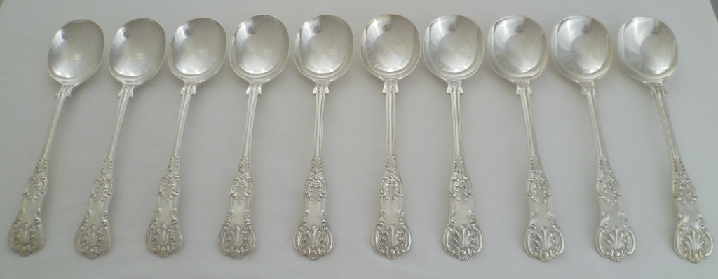 DESCRIPTION | Set of ten large Edwardian silver double struck Queen's pattern soup spoons with no engraving. |