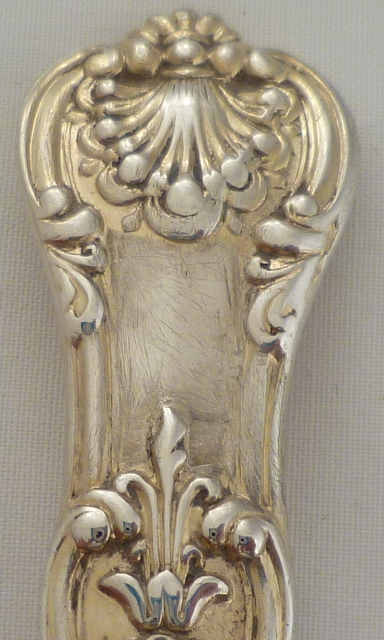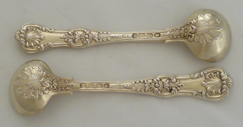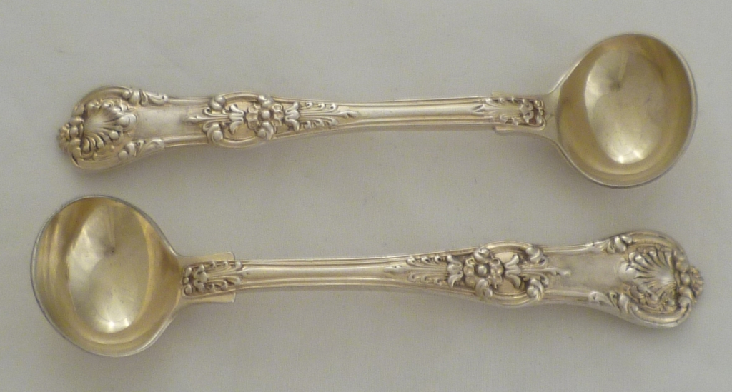 DESCRIPTION | Pair of Georgian silver gilt double struck Queen's pattern salt spoons. |