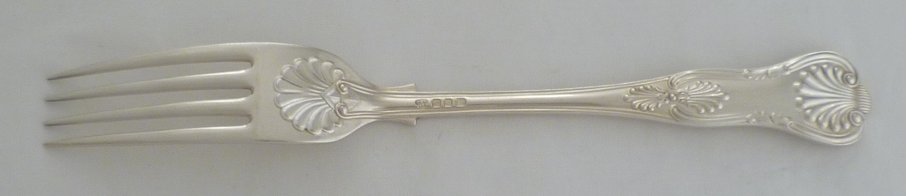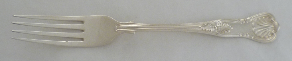 DESCRIPTION | One silver double struck King's pattern with diamond shell heel table fork. |