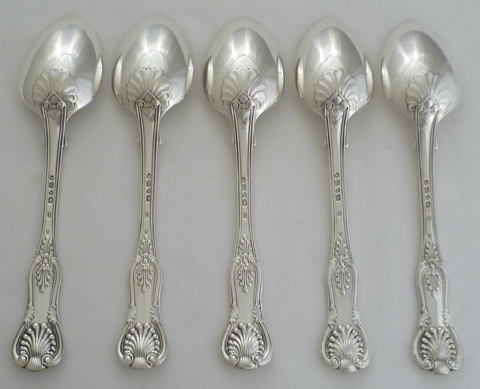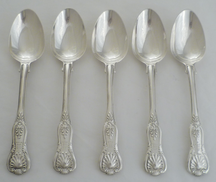 DESCRIPTION | Five Victorian silver double struck King's pattern with diamond shell heel dessert spoons with a frontal crest engraving. |