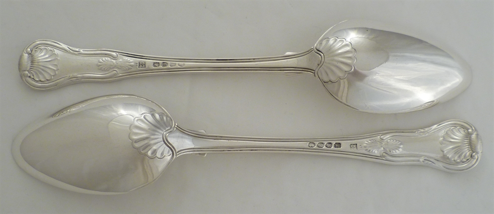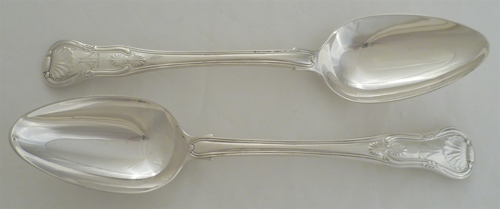 DESCRIPTION | Pair of Georgian silver double struck King's pattern with union shell heel table spoons with frontal crest engraving. |